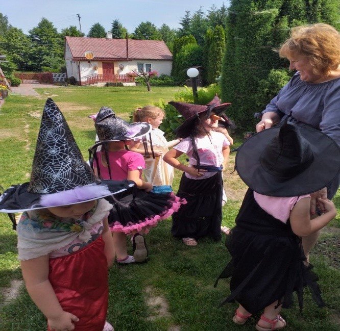 W dniu 13.06.2019 roku „ zerowiaki” ruszyły na kolejną wycieczkę. Tym razem wybór padł na Chatę Rękodzieła Ludowego w Nieborowie. Tematem warsztatów było spotkanie z Babą Jagą. Pobyt rozpoczął się od zjedzenia zabranego ze sobą drugiego śniadania i przypomnienia bajki pt.: „ Jaś i Małgosia” w postacie których wcieliły się dzieci z naszej grupy. Następnie przedszkolaki lepiły z kruchego ciasta paluchy dla Baby Jagi. Paluchy trafiły do pieca, a dzieciaki podzielone na mniejsze zespoły przystąpiły ochoczo do robienia mioteł. Miotły posłużyły jako rekwizyty do kolejnej zabawy, a mianowicie wyścigów na miotłach. Kolejną atrakcją było karmienie kóz, owiec, królików i rybek w zagrodzie. Z przykrością przyjeliśmy wiadomość, że nie spotkamy się z Babą Jagą, która właśnie wczoraj zachorowała. Gospodarze warsztatów stanęli na wysokości zadania i dostarczając nam dwie pełne skrzynie ubrań, masek i peruk pozwolili się nam na chwilę wcielić się w jej postać. Następnie odbyła się dyskoteka w czasie której rozstrzygnięto konkurs na najlepiej przebraną Babę Jagę. Po konkursie zostaliśmy w imieniu Baby Jagi poczęstowani ciasteczkami i pysznymi herbatkami: malinową i cytrynową. Pozostały do odjazdu czas przeznaczyliśmy na wspaniałą zabawę na doskonale urządzonym placu zabaw. To była udana wyciecza!