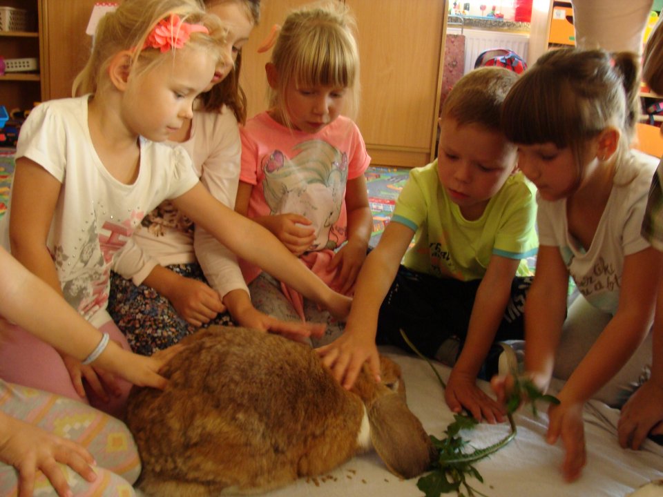 18 września mama Izy i Michała przywiozła do przedszkola prawdziwe króliki. Ta niecodzienna wizyta sprawiła dzieciom niesamowitą radość. Zajęcia rozpoczęły się od wysłuchania wiersza o królikach, a następnie dzieci dowiedziały się co jedzą zwierzątka i mogły je samodzielnie karmić. Pani Basia opowiedziała o tym jak należy się nim opiekować. Przedszkolaki mogły pogłaskać małe zwierzątka i poczuć ich delikatną, mięciutką sierść.