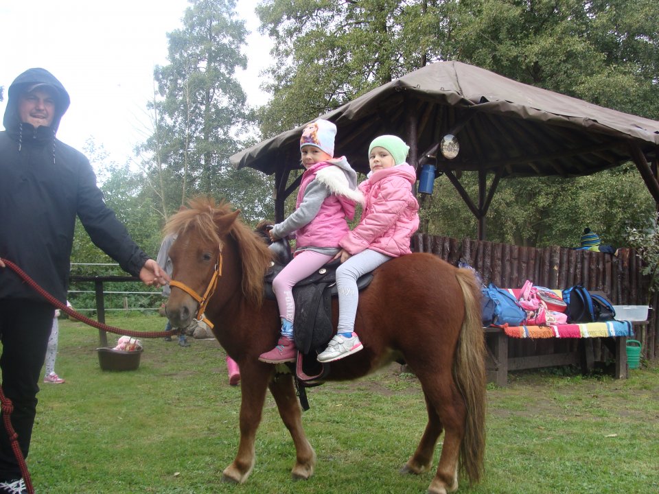 W dniu 27 września 2018 r. dzieci z klasy 0 wraz ze swoją wychowawczynią wybrały się na wycieczkę do Stajni w Zakrzewie. Po miłym powitaniu przez właścicieli wszyscy uczestnicy udali się na olbrzymią łąkę, na której czekały trzy kucyki i dwa wspaniałe konie. Dzieci witały się z kucykami, głaskały je, przytulały, czesały i przypinały do grzywy kolorawe spinacze. Przedszkolaki mogły prowadzać mini kuca. Dużą atrakcją okazała się jazda na kucu szetlandzkim w siodle i ćwiczenia hipoterapeutyczne pod okiem wykwalifikowanego instruktora. Wśród atrakcji znalazło się karmienie i głaskanie królików, zabawy na trampolinie, bujawce, piłkach do skakania, z bańkami mydlanymi i z hula hop. Wielką frajdą okazała się masa solna, z której można było wycinać lub lepić różne zwierzęta. Po zjedzeniu drugiego śniadania dzieci zostały poczęstowane ciasteczkami z owocami i kruchymi ciasteczkami w kształcie koników i królików z własnego wypieku. Tego dnia wiał dość duży wiatr, ale to w niczym nie przeszkadzało uczestnikom w doskonałej zabawie. Różnorodne atrakcje dostarczone przez gospodarzy sprawiły, że nie bylo czasu na nudę i nikt nie chciał wracać. Na zakończenie zrobiono wspólne pamiątkowe zdjęcie. Dzieci podziękowały właścicielom za umożliwienie im przeżycia tych niecodziennych chwil. Pozostaną one na pewno na długo w pamięci zarówno dzieci, wychowawczyni, jak i ich mamą, które były z nimi obecne. Pragniemy w tym miejscu podziękować mamie Izy i Michała, naszych przedszkolaków za nieodpłatne przyjęcie dzieci w rodzinnej Stajni i zapewnienie tylu wspaniałych doznań na najwyższym poziomie.