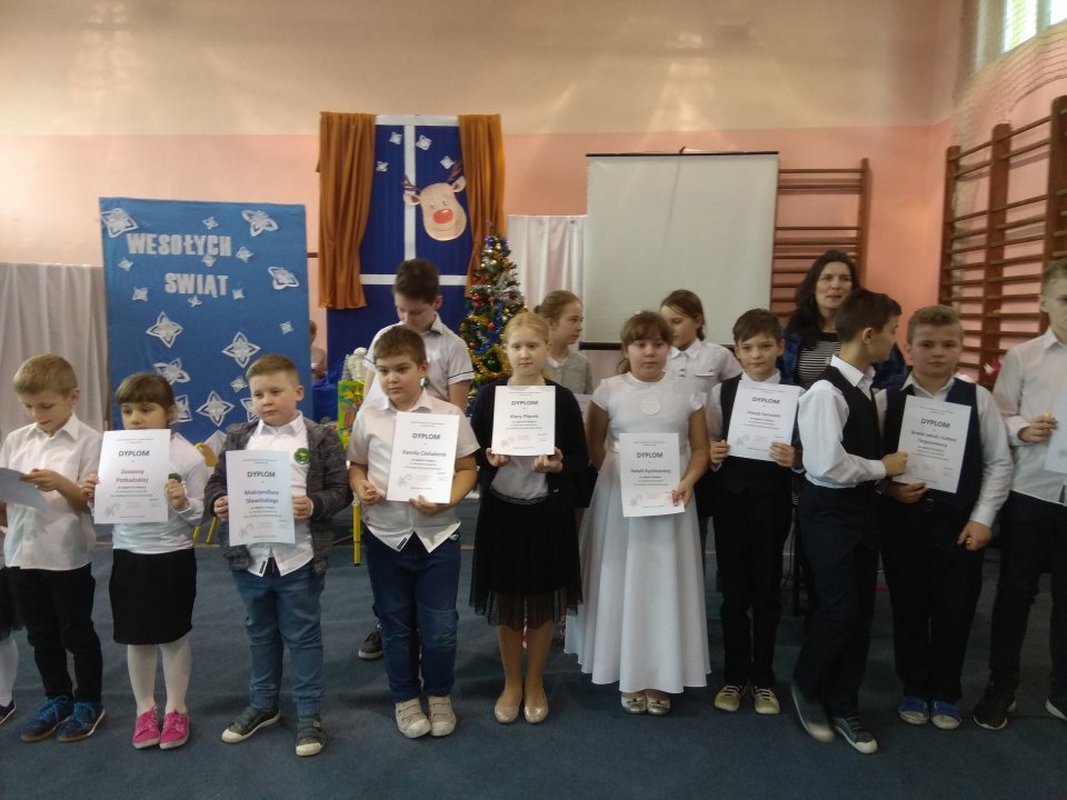 Protokół ze szkolnego konkursu na najpiękniejszą choinkę i ozdobę bożonarodzeniową. Celem konkursu było rozwijanie kreatywności dzieci i młodzieży oraz kultywowanie tradycji świątecznych, a także zorganizowanie kiermaszu dla rodziców. Dochód ze sprzedanych ozdób został przekazany choremu chłopcu – Michałowi Flakowskiemu (zebrano – 800 zł). Konkurs został rozstrzygnięty w trzech grupach wiekowych: Klasy 0- III, Klasy IV – VI, Klasy VII – VIII i III gimnazjum Jury w składzie: Romualda Trzcińska, Renata Pogrzebacz i Aneta Sławińska przyznało miejsca i wyróżnienia w dwóch kategoriach: „Najładniejsza ozdoba bożonarodzeniowa” i „Najładniejsza choinka”. Przy ocenie brano pod uwagę: oryginalny pomysł, estetyka wykonania pracy, ogólny wyraz artystyczny i zgodność pracy z założeniami konkursu. NAJŁADNIEJSZA CHOINKA: I miejsce ex aequo Tymoteusz Jaszczak – kl. 3, Kornelia Zielińska, kl. 3 II miejsce ex aequo Natalia Rutkowska kl. 7, Dawid Bolimowski kl. 3 III miejsce ex aequo Dominik Rychlewski kl. 4, Jakub Rutkowski kl. 3 Wyróżnienie – Zuzanna Poświata NAJŁADNIEJSZA OZDOBA KLASA 0 I miejsce ex aequo – Joanna Sobczak II miejsce (praca grupowa) – Iza Felczak, Michał Felczak, Magda Badowska, Mateusz Bryła. KLASA I I miejsce - Julia Chełstowska II miejsce - Szymon Bolimowski III miejsce - Zuzanna Potkańska KLASA II I miejsce - Zuzanna Szewczyk II miejsce - Adrian Olender KLASA III I miejsce - Maksymilian Sławiński II miejsce - Kamil Ciećwierz III miejsce - Klara Pięcek KLASA IV I miejsce - Miłosz Panek II miejsce - Jakub Kukieła III miejsce – Krystian Dróżdż Wyróżnienie – Bartosz Szewczyk KLASA V I miejsce - Natalia Rychlewska II miejsce - Patryk Famulski III miejsce - bracia Łukasz i Jakub Targaszewscy Wyróżnienie – Łukasz Rogalski KLASA VI I miejsce - Wojciech Milczarek II miejsce - Zuzanna Adamiak III miejsce - Urszula Mońka KLASA VII I miejsce - Karolina Potkańska II miejsce - Sebastian Mihut III miejsce - Oliwia Gala KLASA VIII I miejsce - Patrycja Kowalczyk II miejsce - Sylwia Rogalska KLASA III gimnazjum I miejsce - Waldemar Leszczyński II miejsce - Natan Paździor III miejsce - Wójtowicz Paweł. Wszystkim uczniom biorącym udział w konkursie dziękujemy, a nagrodzonym – gratulujemy! Organizatorzy konkursu: Romualda Trzcińska, Renata Ogrzebacz, Aneta Sławińska i Dorota Skumiał. SUKCESY NASZYCH UCZNIÓW Jak co roku uczniowie naszej szkoły chętnie biorą udział w różnych konkursach organizowanych w szkole i powiecie. W okresie Bożego Narodzenia odbył się Powiatowy Konkurs na najładniejszą ozdobę oraz na najładniejszą choinkę. Nasi uczniowie zdobyli następujące nagrody: Ø II miejsce w powiecie za najładniejszą ozdobę - Maksymilian Sławiński, uczeń klasy 3. Ø II miejsce w powiecie za najładniejszą ozdobę - Waldemar Leszczyński, uczeń klasy 3 gimnazjum. Ø Wyróżnienie w powiecie za najładniejszą ozdobę - Kamil Ciećwierz, uczeń klasy 3. Ø Wyróżnienia w powiecie za najładniejszą choinkę: Tymoteusz Jaszczak, Dawid Bolimowski, Dominik Rychlewski i Natalia Rutkowska.