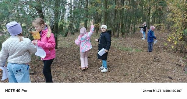 Lekcja przyrody w terenie. Wtorek, 11 listopad 2025 Lekcja przyrody w terenie. W środę 22 października klasa 2 wybrała się na spacer do lasu. Dzieci uczyły się rozpoznawać i nazywać drzewa znajdujące się w lesie, zbierały liście każdego z nich, dowiedziały się jak wyglądają drzewa liściaste i iglaste. Na koniec w klasie z zebranych skarbów zrobiliśmy wspólny zielnik.