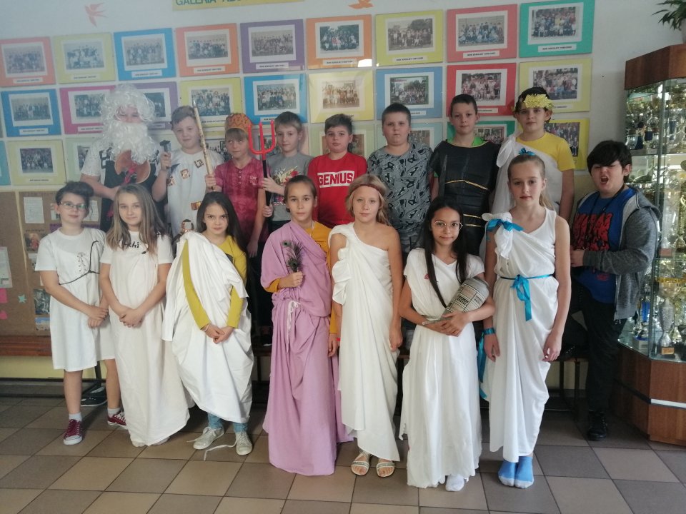 Wspólnie z uczniami postanowiliśmy urozmaicić lekcje historii i wymyśliliśmy ciekawy projekt. . Na jednej z październikowych lekcji historii w klasie V, kolejny raz rozmawialiśmy o starożytnej Grecji. Tym razem jednak chcieliśmy przeżyć tę lekcję nieco inaczej. Uczniowie przebrali się za starożytne Greczynki lub Greków. Niektórzy byli w strojach nawiązujących do konkretnych bogów i mieli ich atrybuty. Była Hera z pawimi piórami, Hefajstos i Ares. Odbyła się także degustacja greckiego sera z oliwą i chlebem, oraz winogron. Uczniowie ustawili się do zdjęć tworząc swego rodzaju żywe obrazy. Ta lekcja na długo pozostanie w pamięci jej uczestników.