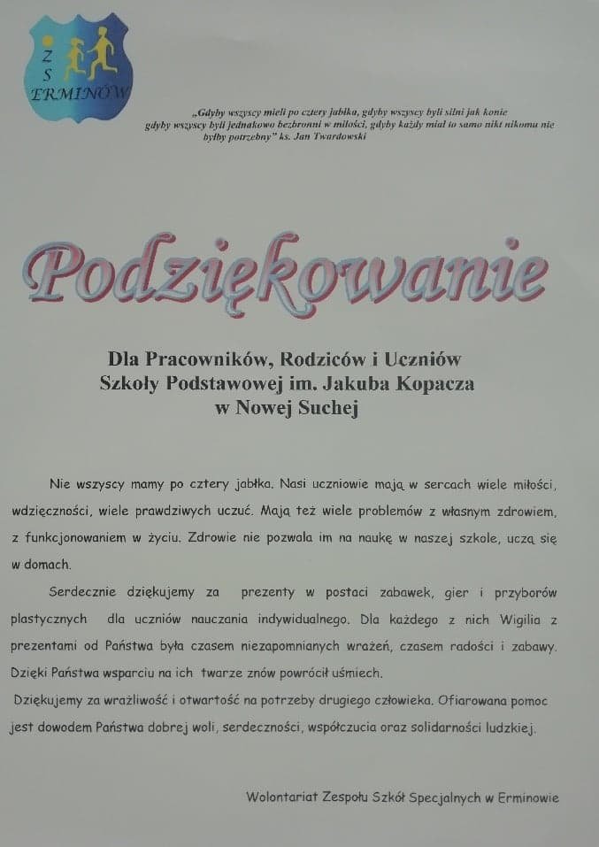 Podziękowanie od Zespołu Szkół Specjalnych w Erminowie